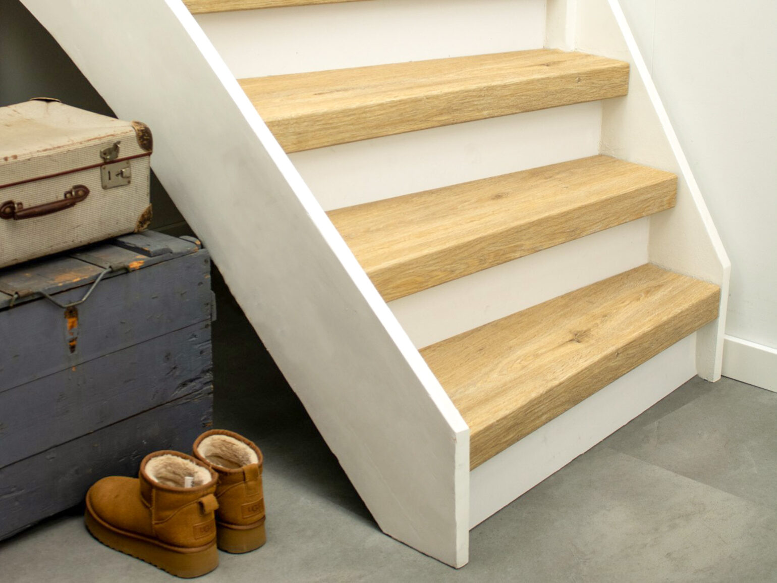 De Corfu PVC-traprenovatie heeft een prachtige brushed oak uitstraling die goed tot zijn recht komt in ieder interieur. Wil je graag van je trap en interieur één geheel maken? Kies dan voor een stootbord in dezelfde kleur als de vloer. Wil je graag voor een andere look gaan, kies dan voor een wit stootbord of een zwart stootbord. De traptreden zijn 8 mm dik en de neuslijsten hebben een hoogte van 70 mm, wat zorgt voor een stijlvolle afwerking. De Corfu PVC-traprenovatie is gemaakt van 100% schoon materiaal en biedt een hoge kras- en slijtvastheid.