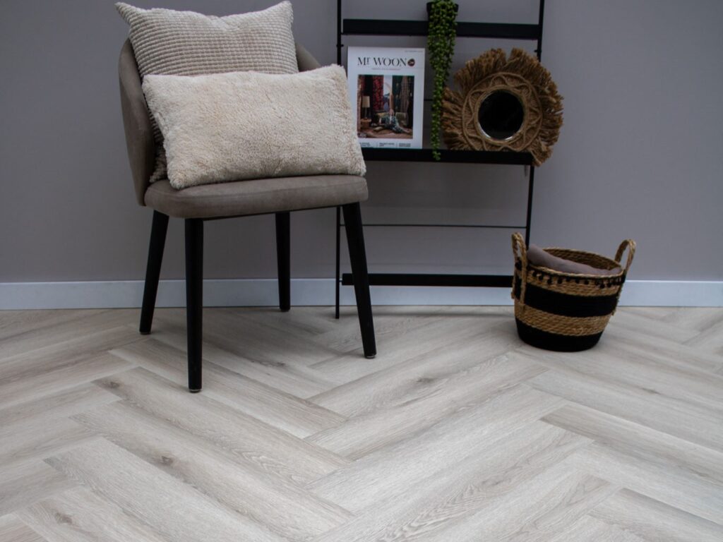 Een rustige PVC-visgraatvloer met een lichtgrijze uitstraling, voor wie op zoek is naar een vloer die zowel stijlvol als duurzaam is. Door het gebruik van uitsluitend 100% schoon materiaal voldoet EKOFLOORS aan de groeiende vraag naar milieuvriendelijke producten. De Eufraat visgraat klik is een PVC-vloer met een slijtlaag van wel 0,55 mm, waardoor de vloer bestand is tegen de meeste vormen van slijtage.